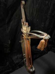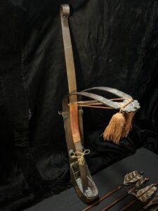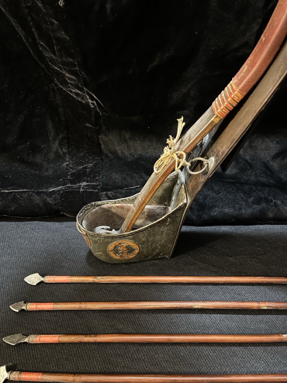 This antique Japanese Samurai palanquin bow and arrows set is in exceptional condition. The nock is broken off one arrow–this arrow has a signed yanone point.