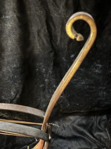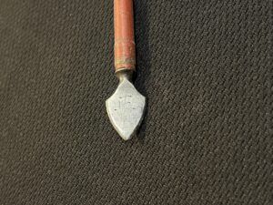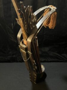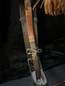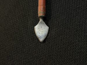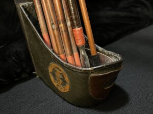 The quiver is made of wood and leather. A Samurai family mon adorns each side of the lower leather portion of the quiver. A boar’s eye is on the front of the leather as well.