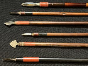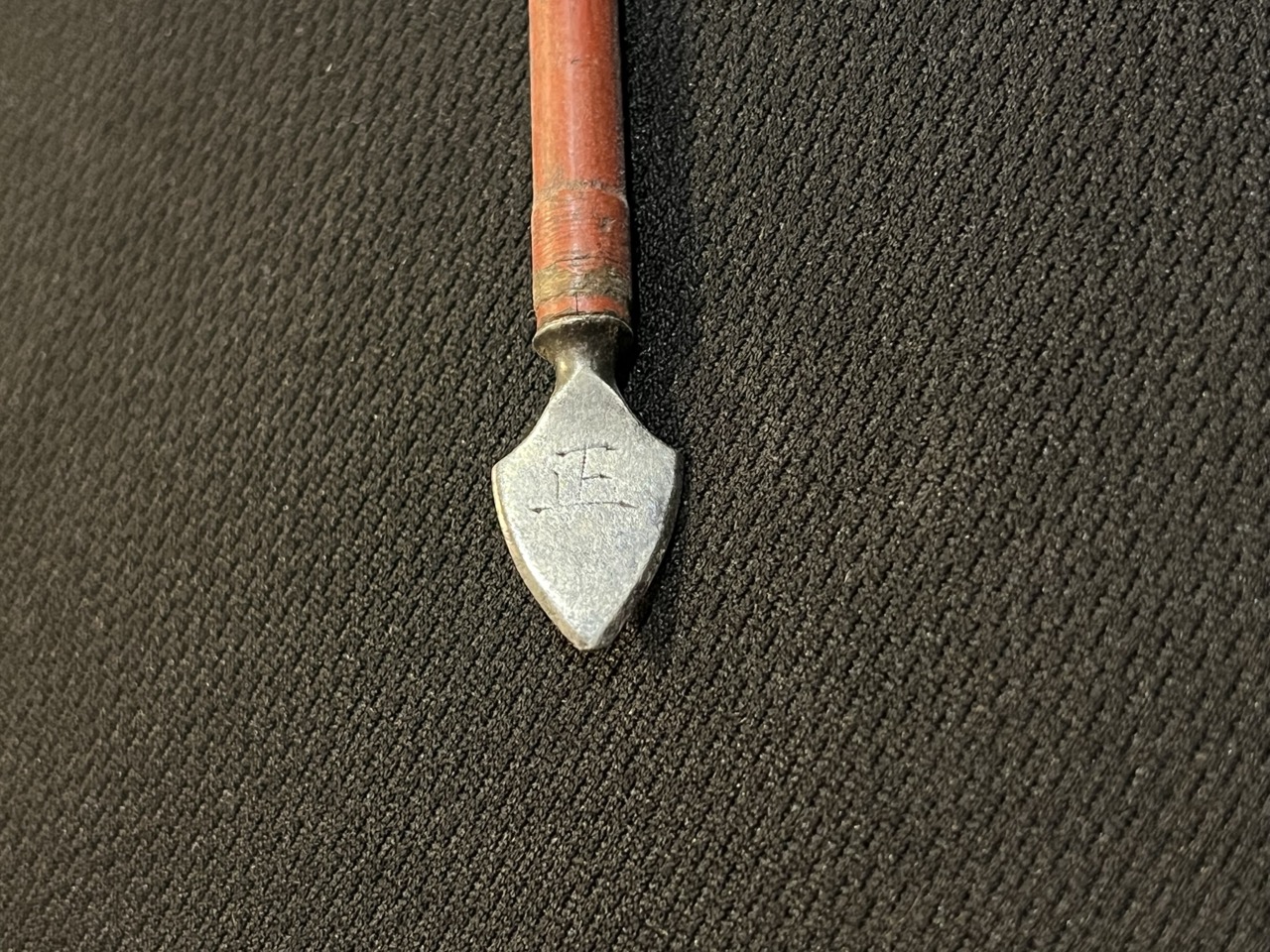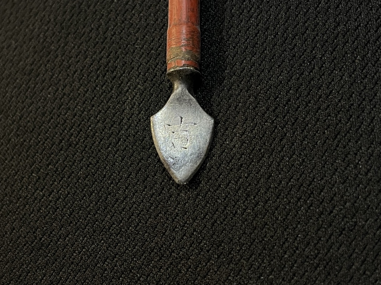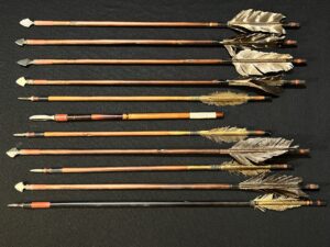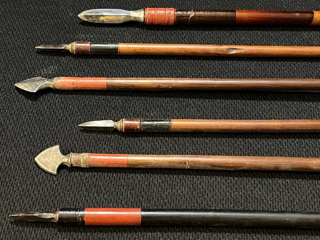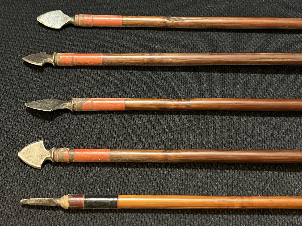 The bow measures approximately 60 cm in length. There are 11 arrows–all with forged yanone points. Two of these points are signed. The others may be as well, but the yanone are firmly fixed in the bamboo shafts on the other 9 arrows.