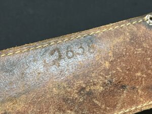 This two-line stamp Marbles measures 12 7/16” overall. The Marbles sheath has the Marbles snap. The back of the original sheath has the number ‘1638’ written on it.