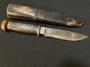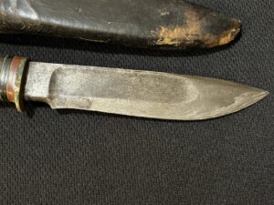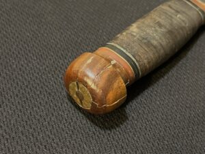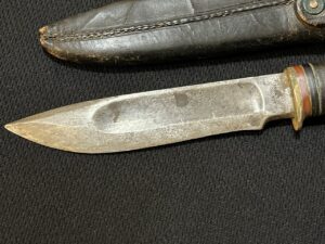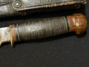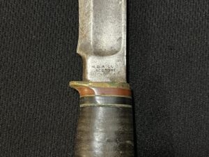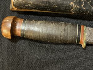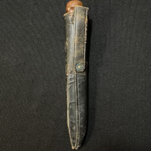 The pommel is made of lignum vitae, and this knife’s original tube sheath is still present!