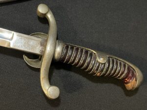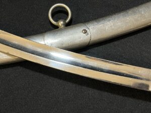 The scabbard is stamped ’25’ in several places. The blade spine is stamped with a letter–it looks like a letter ‘G’ we think.