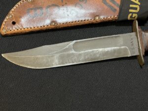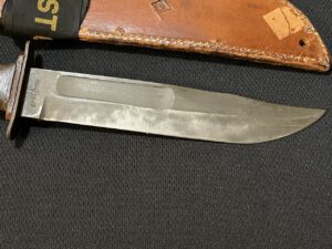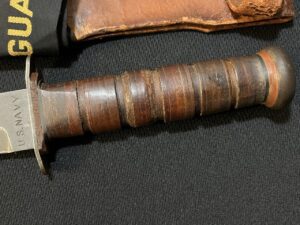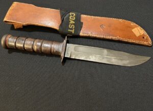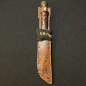 Knives carried by U.S. Coast Guard members in WW2 are difficult to find. The front of the sheath is marked with sergeant’s stripes, and ‘USCG’. The crew member also put his initials at the bottom of the sheath ‘C.B.’.