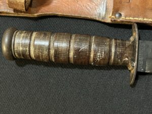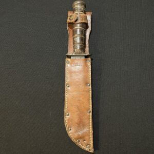 Design History: Early in WWII, Camillus introduced this version and secured the pommel to the tang with a threaded lug nut. As a result, the knife displays a distinctive round pommel with visible threading at the end.