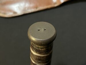 Most notably, this WWII-era Camillus U.S.N. Mark 2 features the rare threaded “nut pommel,” commonly referred to as the “screw pommel.” Camillus manufactured this configuration only for a short period in the early 1940s. Shortly thereafter, the company replaced it with a more durable pinned pommel design.