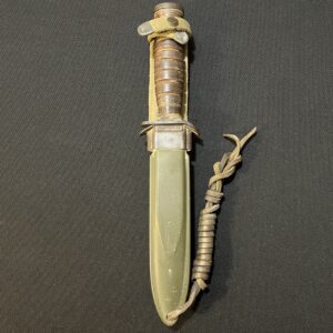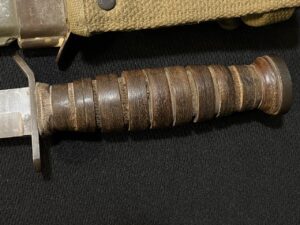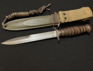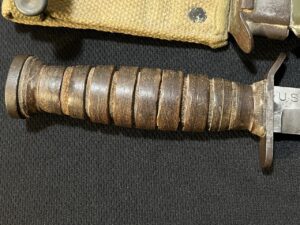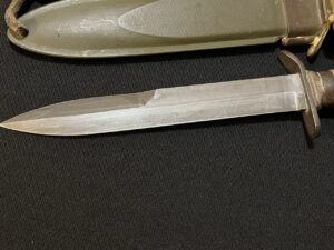 The knife, according to Mike Silvey’s condition scale, is in mint condition. The knife blade shows no sign of use, and has its original unused factory edges. The blade has only slide marks from being slid in and out of the scabbard. The handle is perfect. The guard is perfectly tight. The M8 sheath is in exceptional condition, and still has its leather leg tie-down thong.