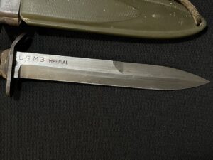 1 unissued condition blade-marked US WWII Imperial M3 trench knife w/M8 scabbard available. This U.S. M3 fighting knife would make an important addition to any collection.