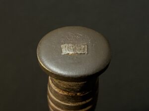 The knife’s blade measures 6 13/16″. This knife measures 11 11/16″ overall. The pommel is peened, and has the flaming bomb stamp.
