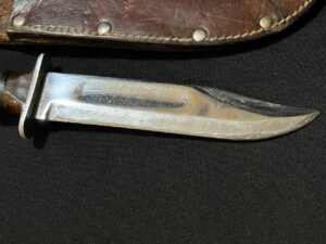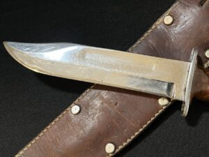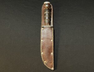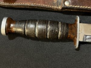 Stamped on the guard is ‘KA-BAR OLEAN, N.Y.’. This knife measures 10 1/2″ overall. The blade measures 5 7/8″.