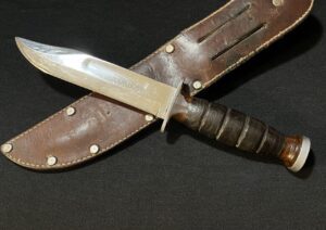 1 antique U.S. WWII Kabar fighting knife. This knife is known as the ‘Polished Commando Knife‘.
