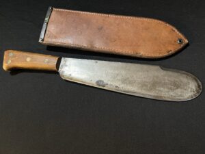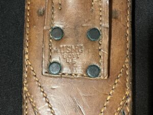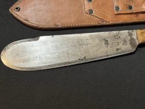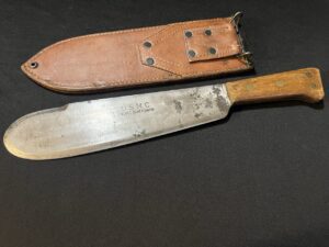 The blade is marked ‘U.S.M.C. VILLAGE BLACKSMITH’. The scabbard is marked ‘ USMC BOYT 45 ‘.