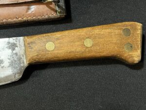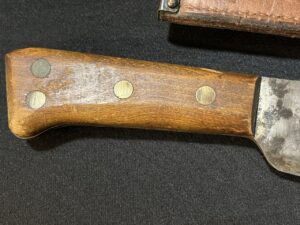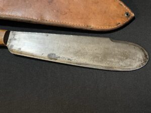 The blade edge is sharp on this WWII USMC bolo machete. The blade surface has some carbon staining and some light, surface mild pitting. The scabbard is in exceptional condition.